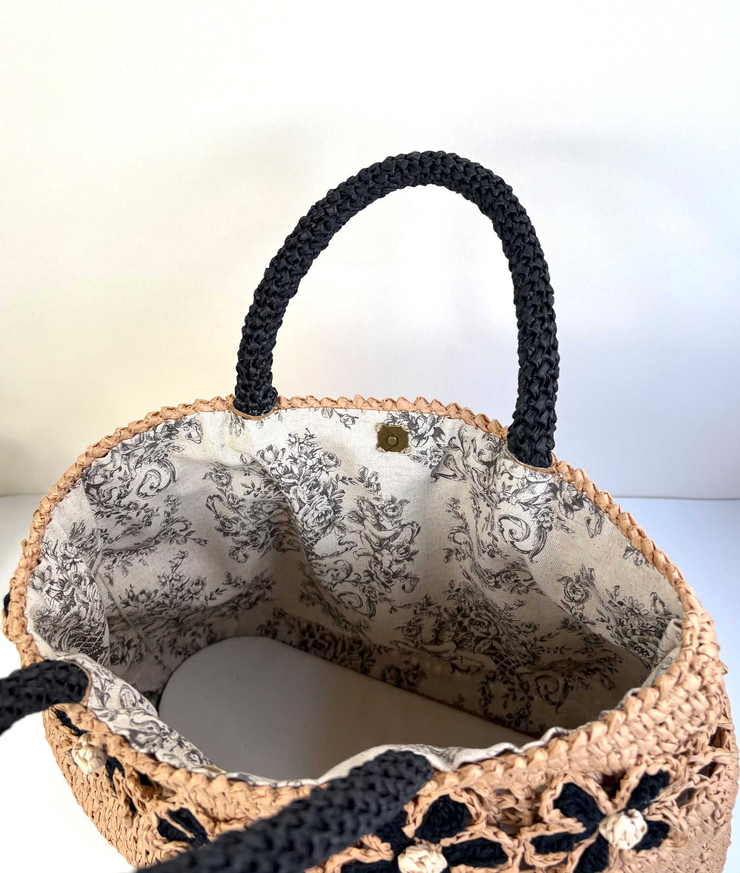 可愛らしい丸みを帯びたシルエットに、黒の花モチーフ飾りがシックな大人っぽさを印象付けるデザインです。