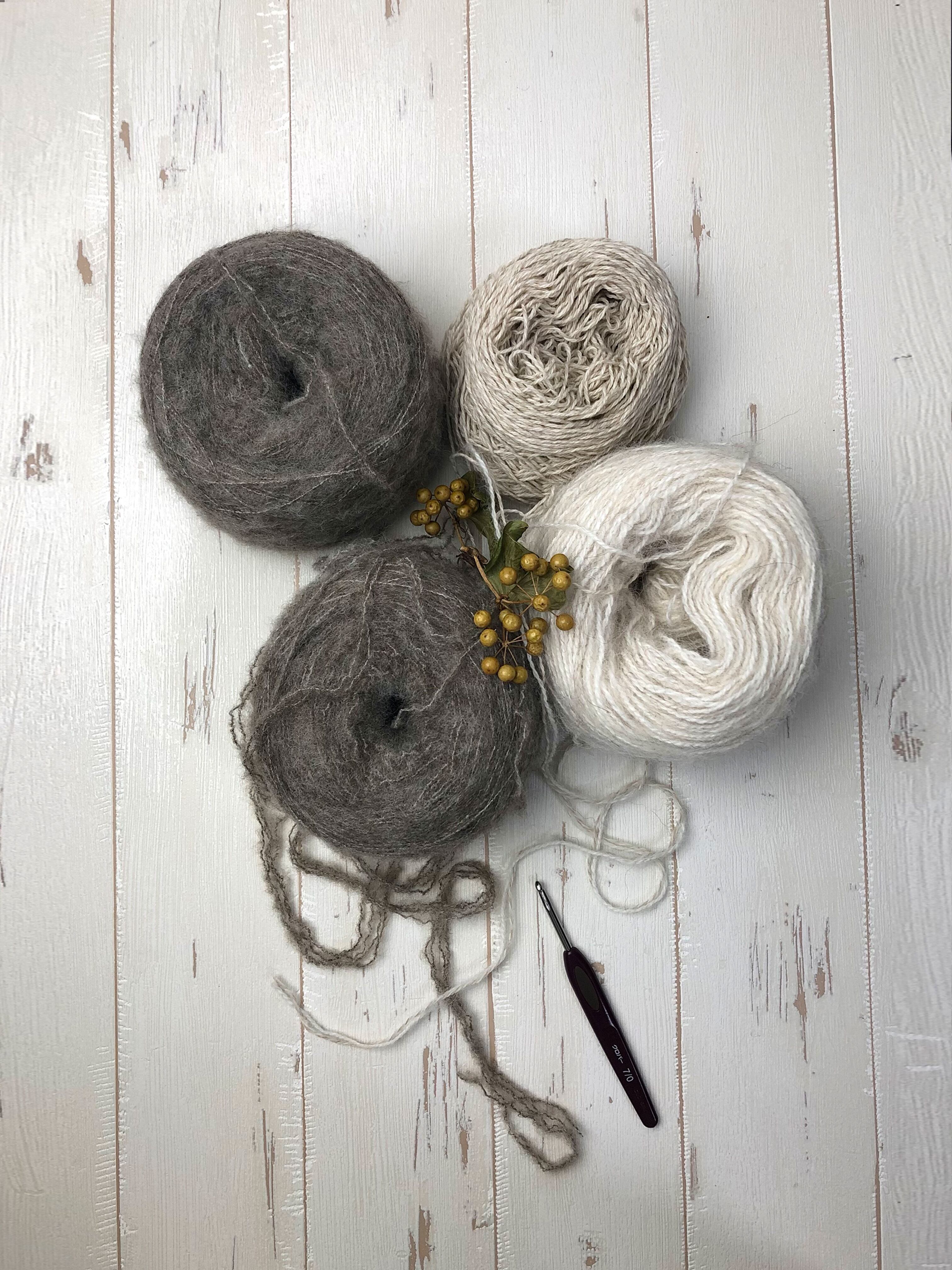 3種類の糸を使っています。イタリーの老舗紡績メーカー「E.MIROGLIO社」と「PAPI FABIO 社」を使用しています。Ivoryの糸は「E.MIROGLIO社」の毛足の長めの糸で、生産数の少ない希少なアルパカ繊維で丈夫で毛玉ができにくく、軽くて保温性に優れている素材です。繊維の中心が空洞になっているため、そこに暖かい空気をため込むことができます。そして一緒に引き揃えている糸は「PAPI FABIO 社」の糸でメランジタイプのストレートのウール混です。Greigeの糸は「E.MIROGLIO社」の糸で短い毛足に起毛をかけたふわふわ、しっとりした手触りの糸です。