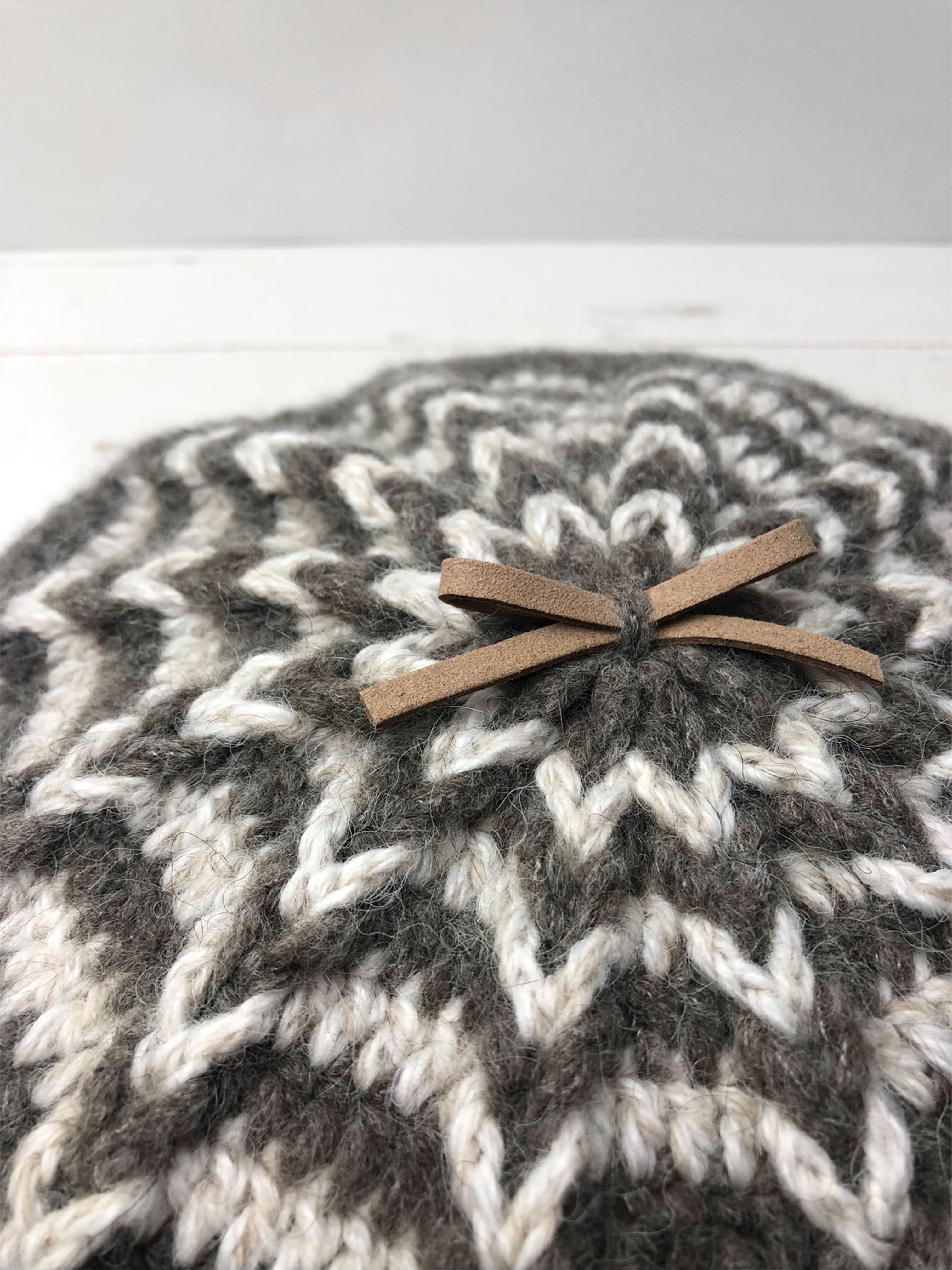 星のような形が放射状に広がる凹凸感ある模様編みが美しく目を惹きます。GreigeとIvoryの配色が柔らかな印象。トップ中心にレザーリボンを乗せて可愛らしいポイントにしています。レギュラーシルエットより若干深めに作っていますので、被ってから少しお好きな形に整えていただくとスタイリッシュな感じになります。日々のコーディネートに楽しんで合わせていただけたら幸いです♫