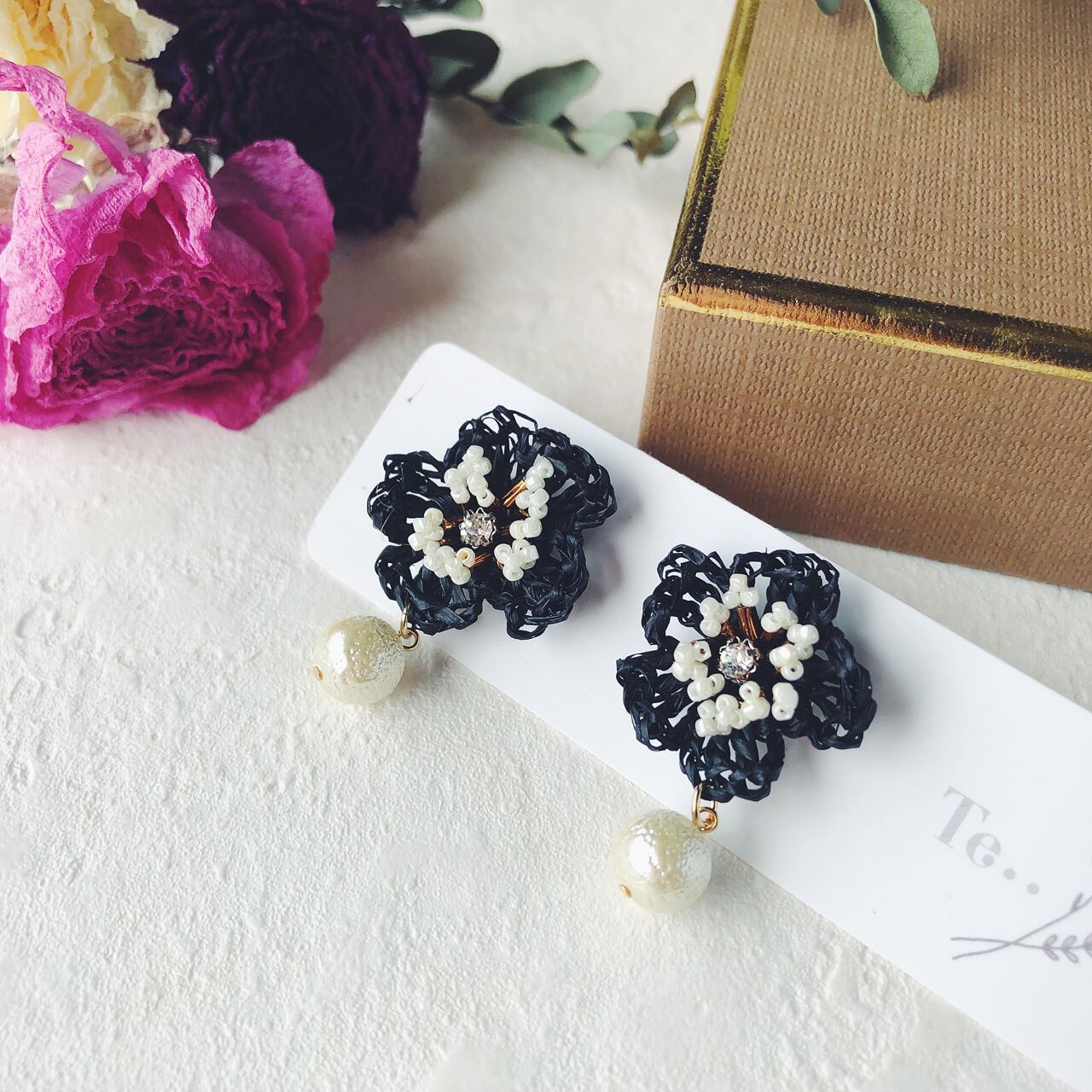 天然素材「マダガスカルラフィア」をかぎ針で編んだ花にビーズ刺繍を合わせたイヤリングです。
