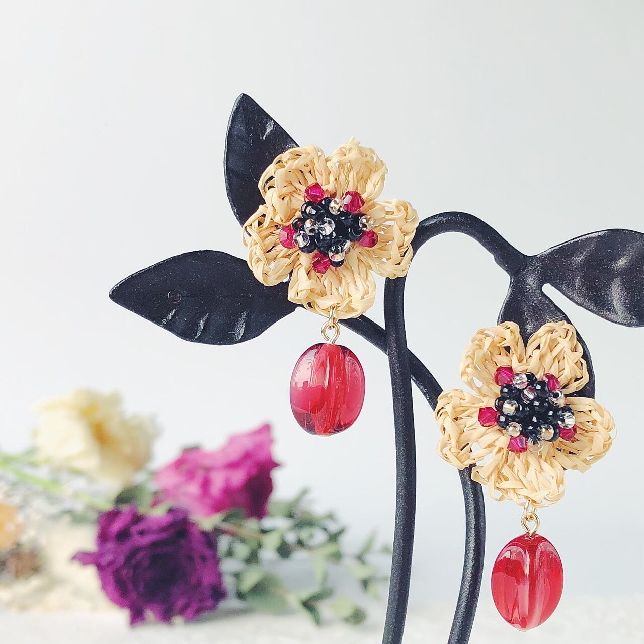 ラフィアの花のビジューイヤリング