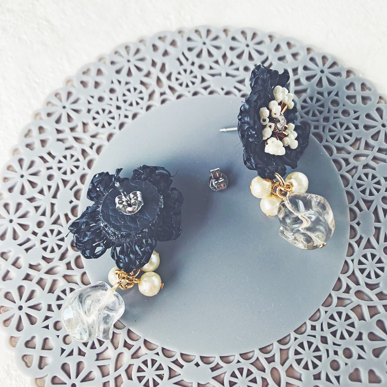 ラフィアのラスティックな風合いと異質なガラスビーズとのミスマッチが個性的に美しく響き合っています。ツイスト状に変形された透明チェコビーズはキラキラと輝きます。その上に小さなコットンパールを3個飾り可愛らしく揺れるアクセントにしました。黒のラフィアとの相性がとても涼しげに映えます。