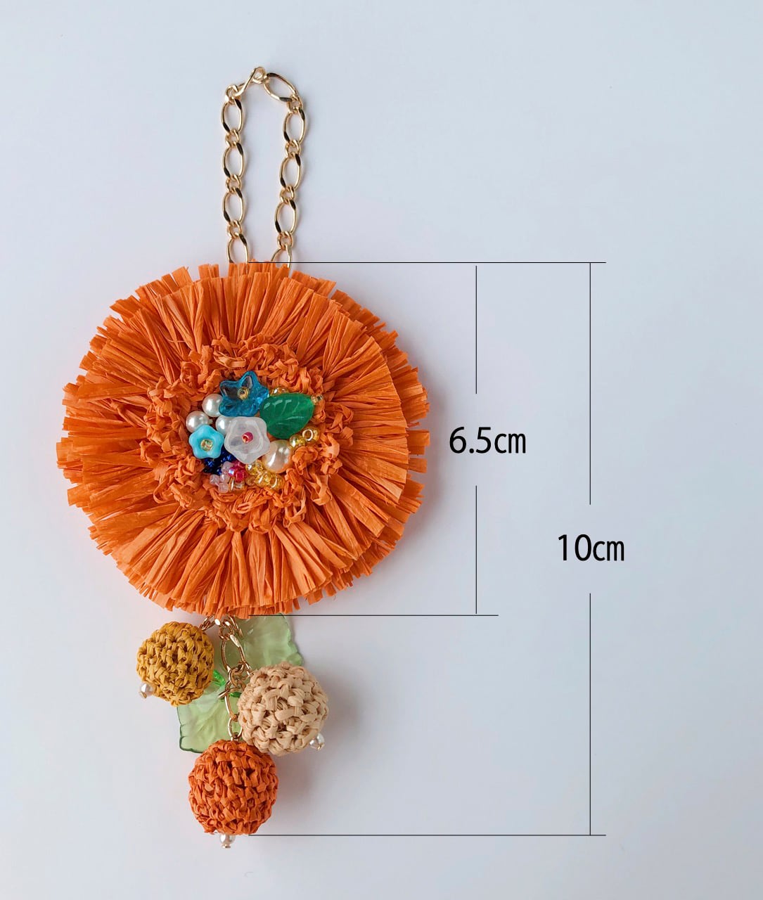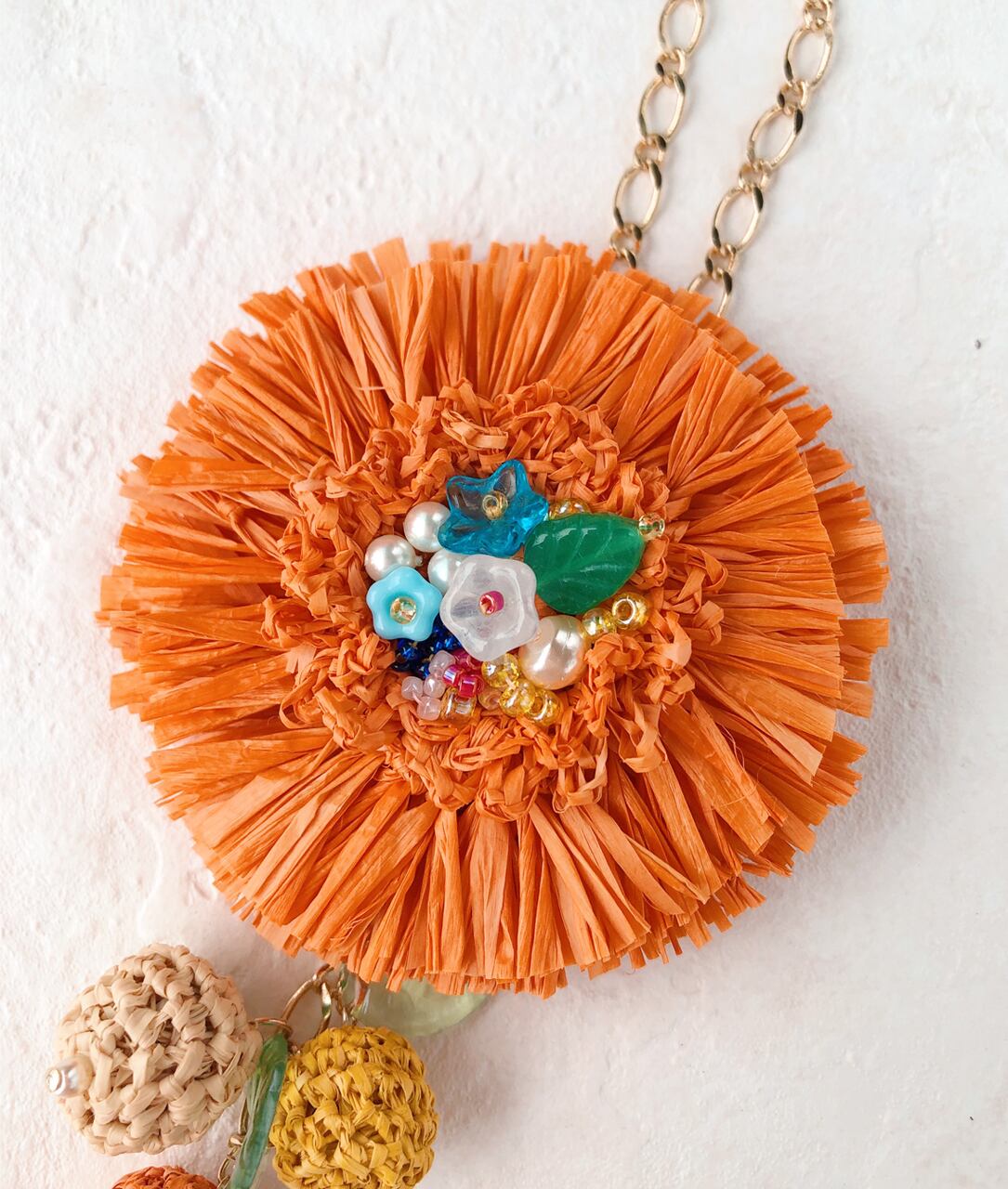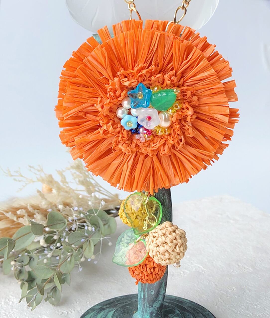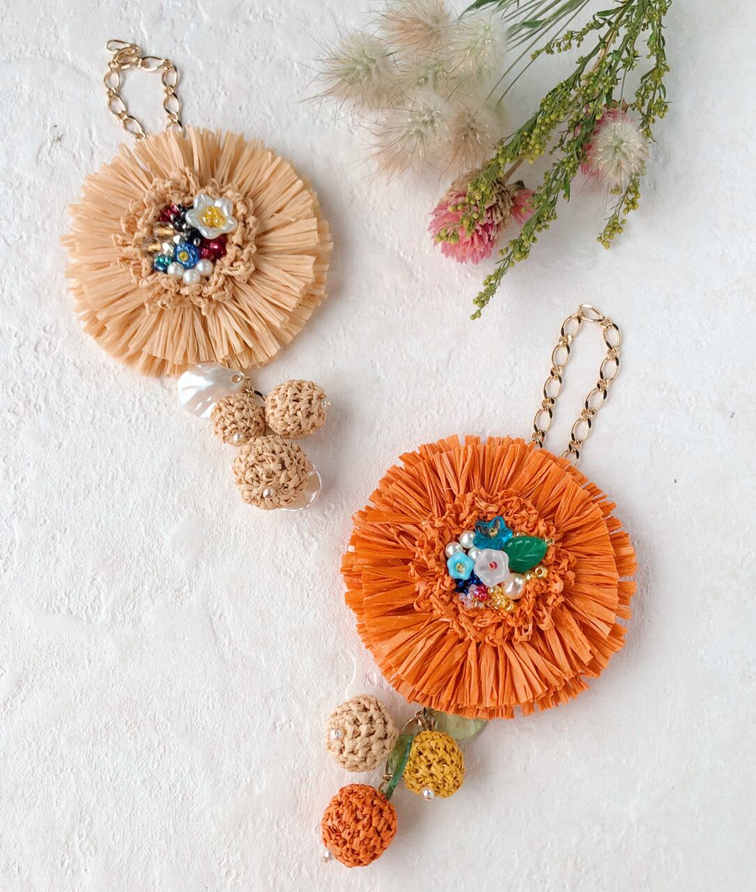 チャームは天然素材「マダガスカルラフィア」を使い、かぎ針で編んだフリンジの花にビーズ刺繍を合わせました。