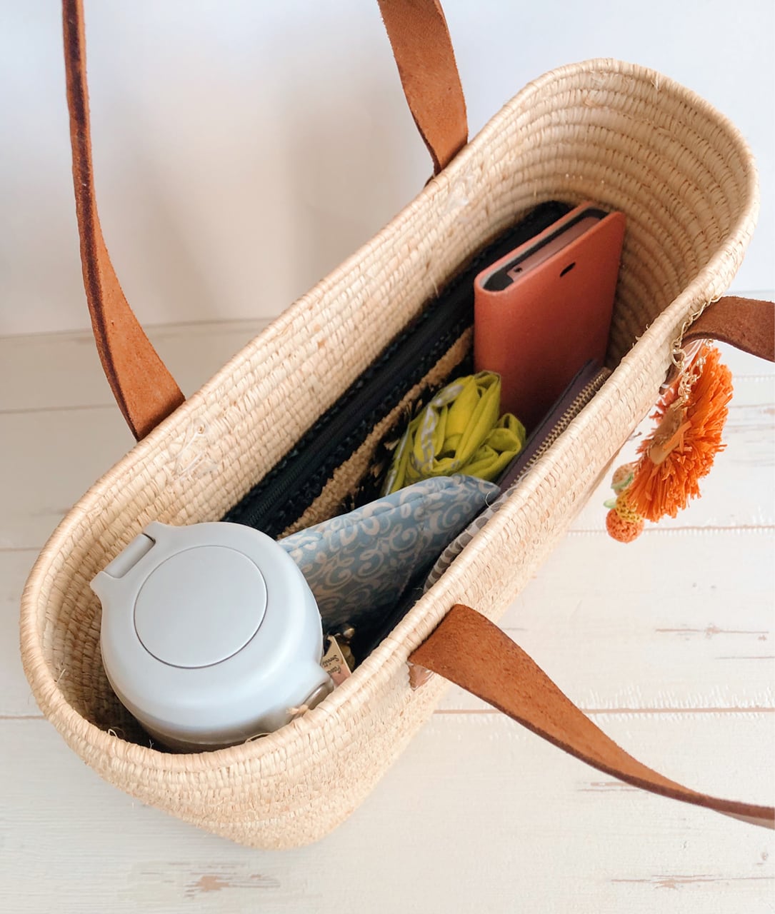 バッグのナチュラルカラーにオレンジのチャームが明るく生き生きと映えます。