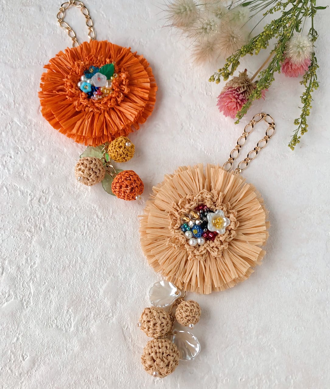 チャームは天然素材「マダガスカルラフィア」を使い、かぎ針で編んだフリンジの花にビーズ刺繍を合わせました。