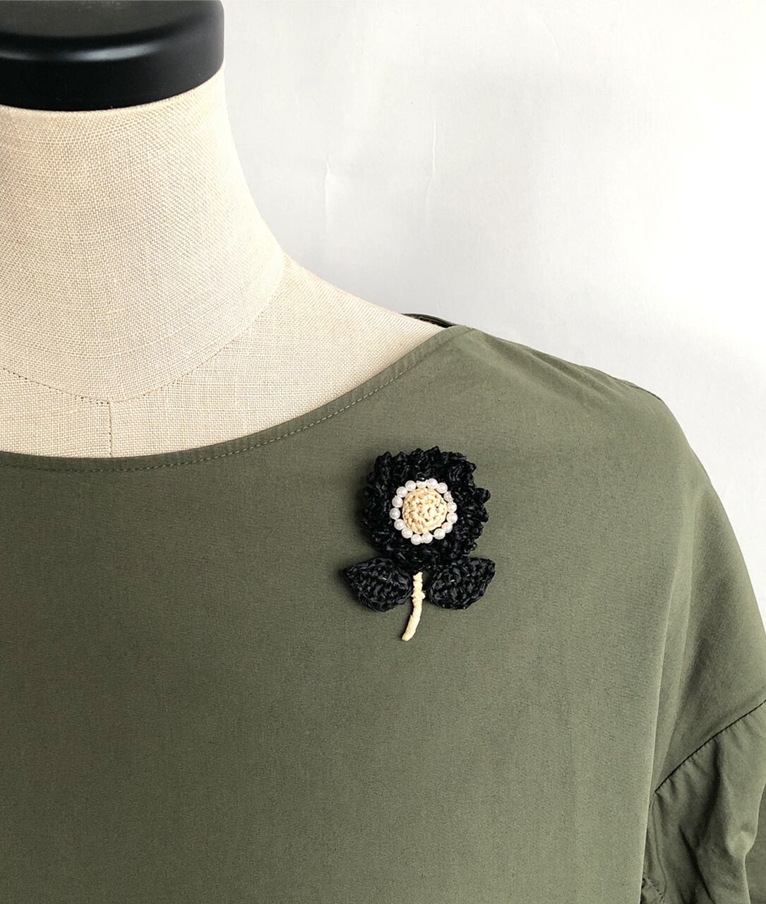 全体の形はとてもシンプルですが、クシュクシュに縮れさせた花びらの中央にビーズを刺繍して華やかさを加えました。また、黒ベースに白のパールが大人っぽくエレガントです。