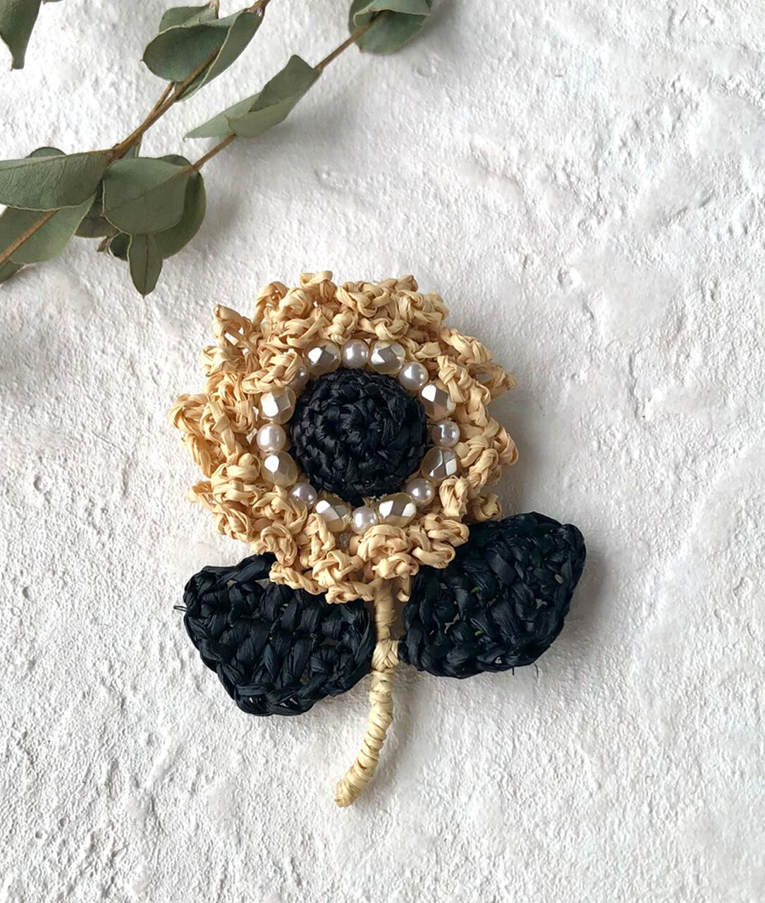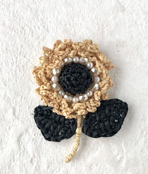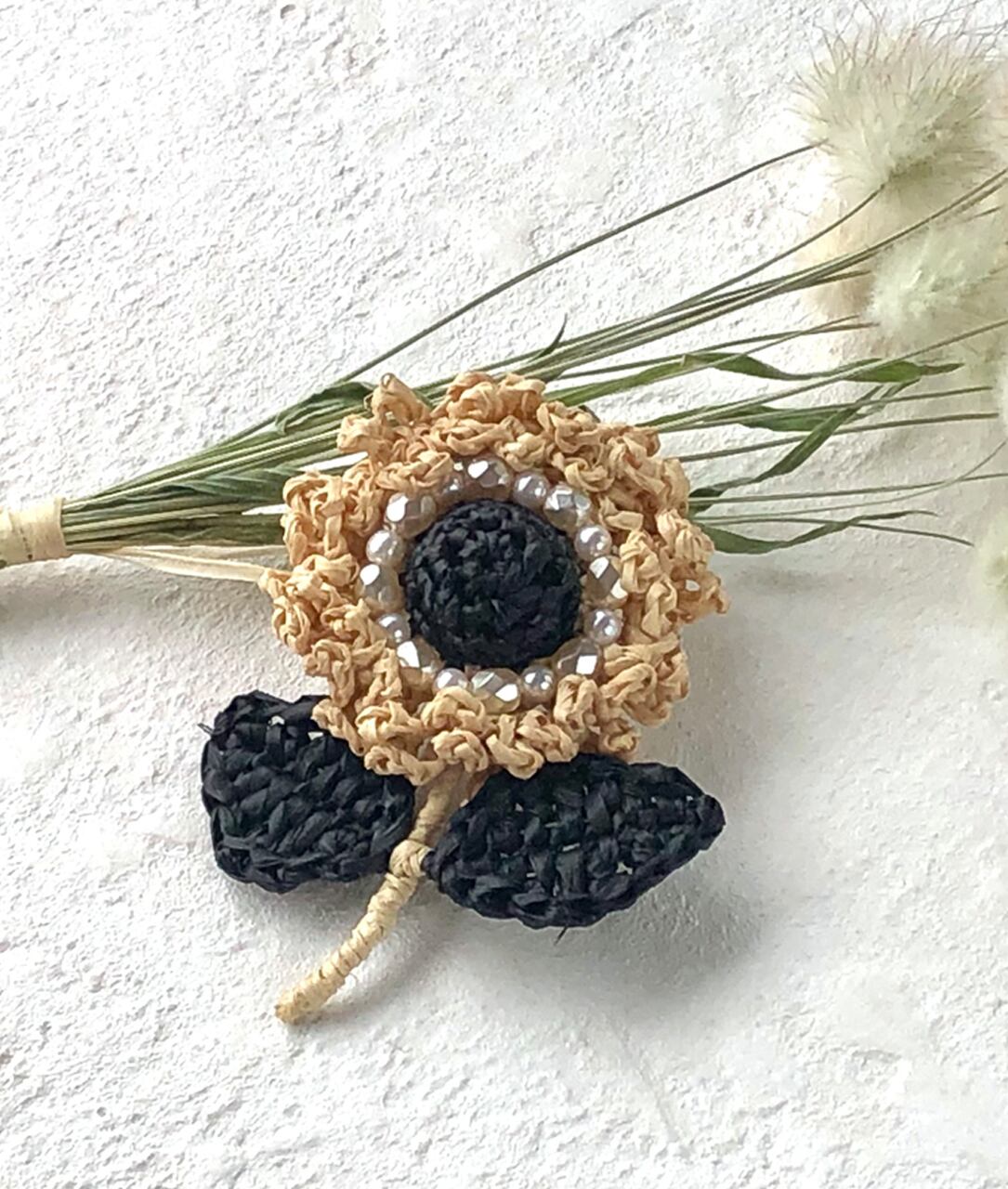 全体の形はとてもシンプルですが、クシュクシュに縮れさせた花びらの中央にビーズを刺繍して華やかさを加えました。ナチュラルカラーに黒がシックに引き締めカラーとなり大人っぽくエレガントです。