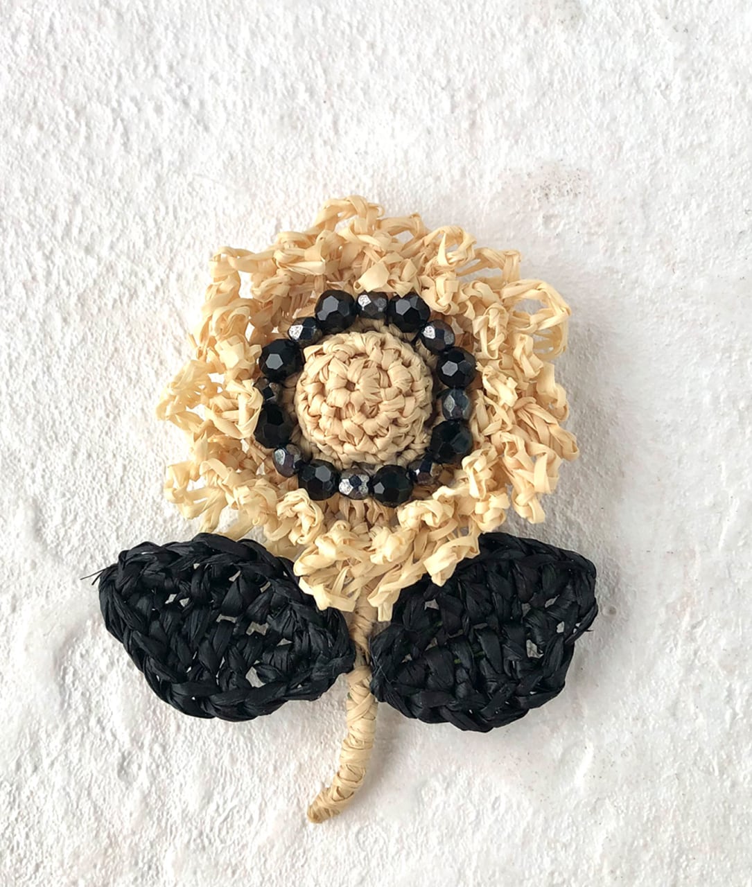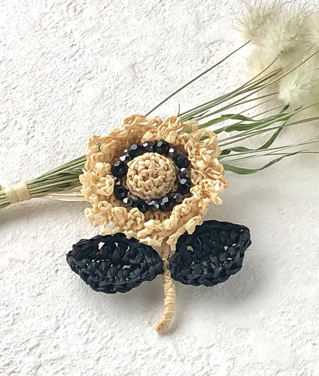 全体の形はとてもシンプルですが、クシュクシュに縮れさせた花びらの中央にビーズを刺繍して華やかさを加えました。ナチュラルカラーに刺繍した黒とグレーのファイヤーポリッシュというビーズがとてもシックです。