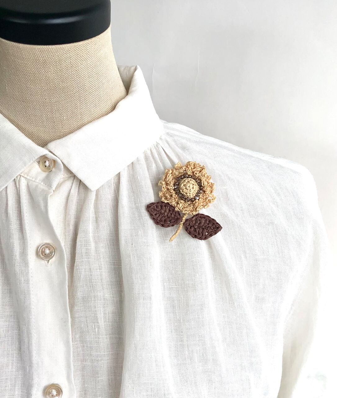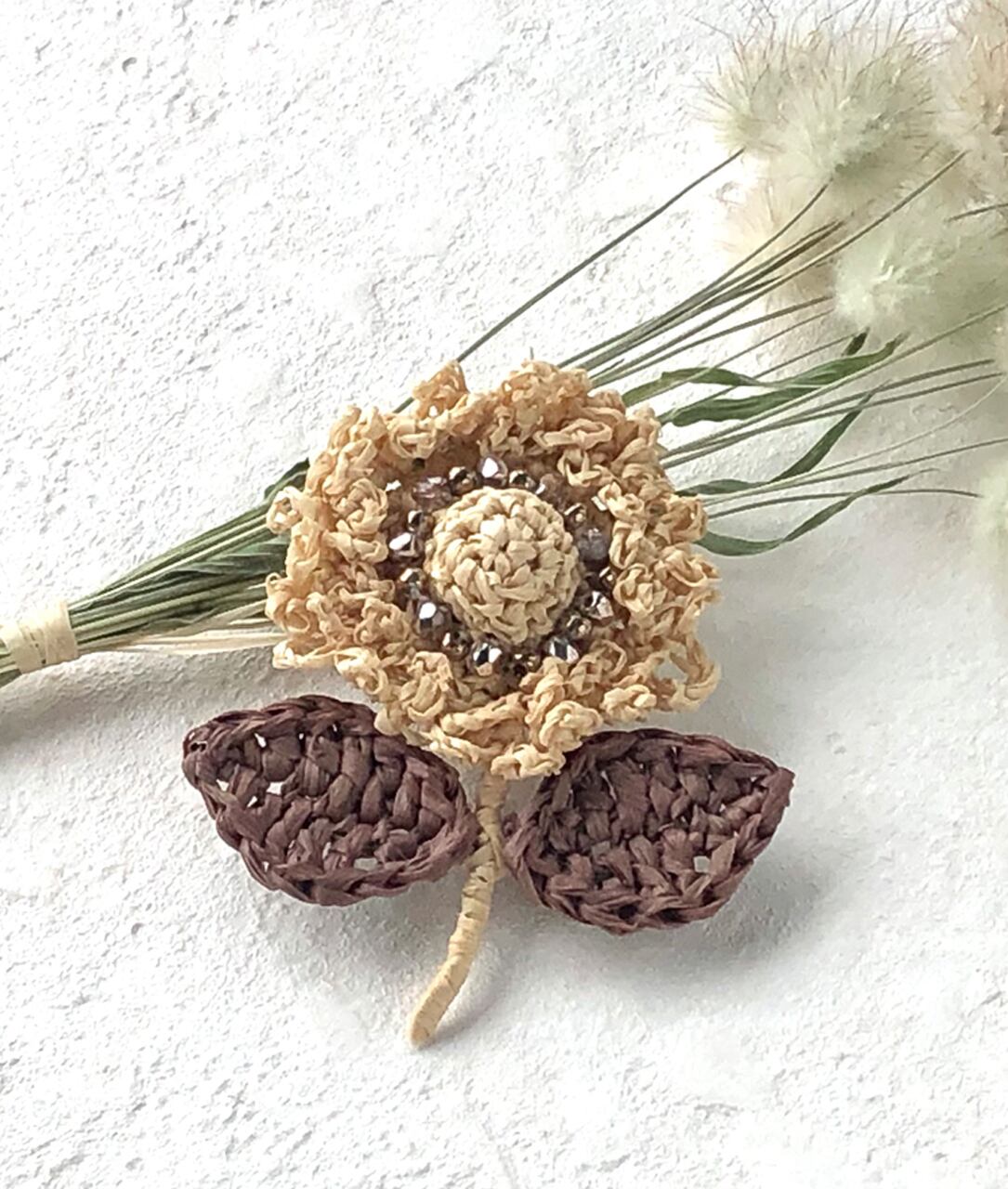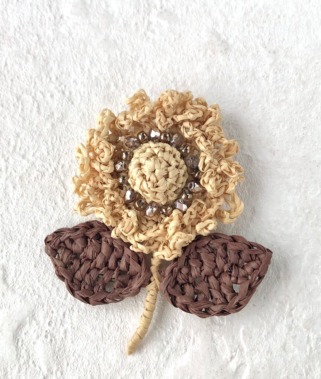 ラフィアで編んだ花のブローチです。