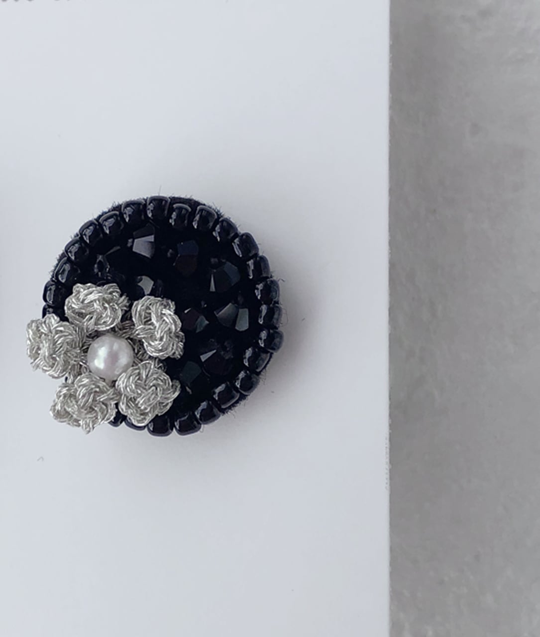 ブラックをベースにしたビーズ刺繍にかぎ針で編んだ銀色のお花を乗せたイヤリング・ピアス。光の反射で優雅にキラキラと輝く黒のジェットビーズに銀色の小さなお花が優しさを添えています。