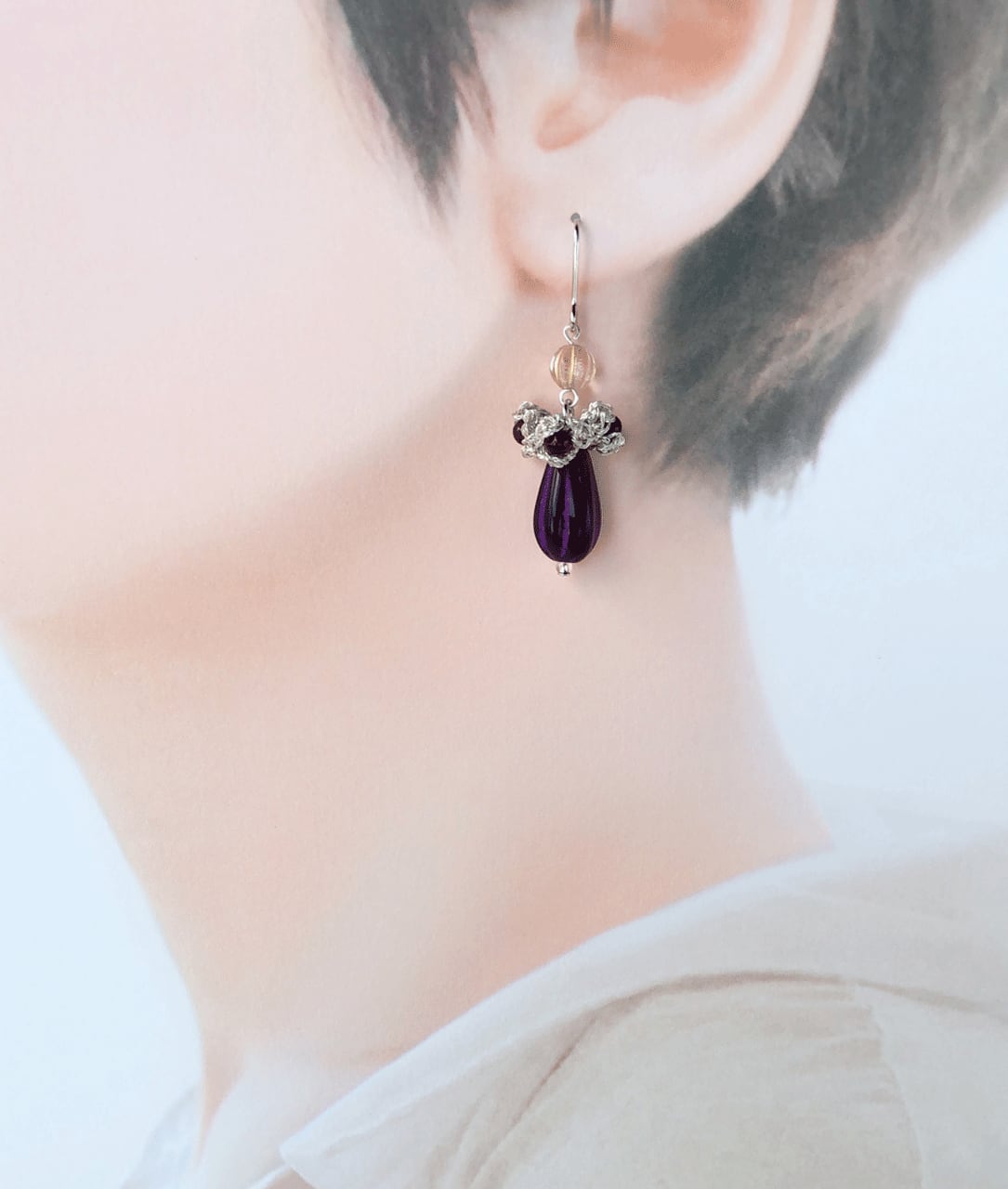 チェコビーズは秋の味覚「葡萄」に似た深く美しいパープル。メタリックな輝きの銀色の小花をアレンジして大人可愛い印象にしました。