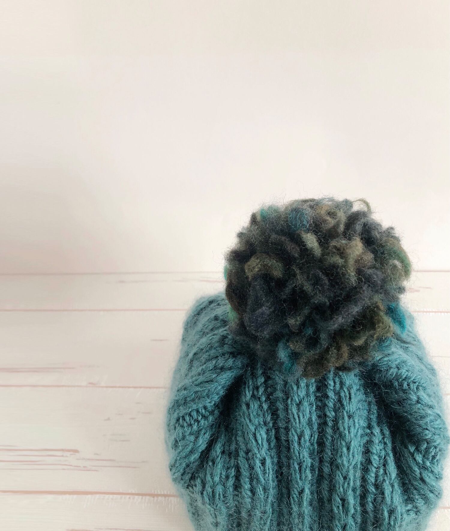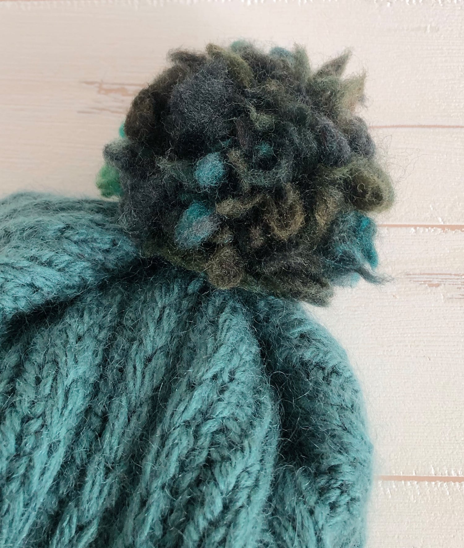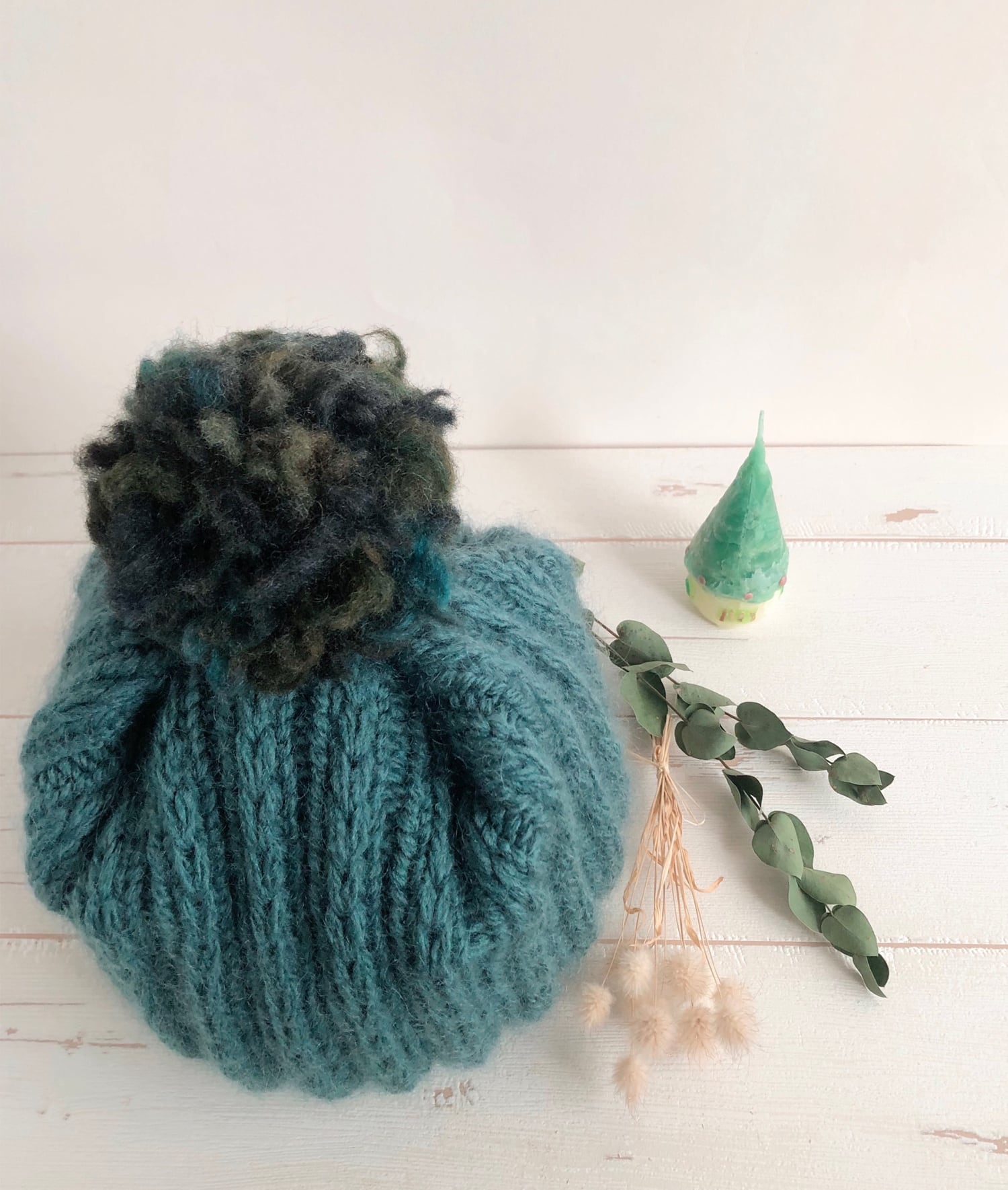落ち着きと共に華やかさも感じられる上品なエメラルドグリーンの色と、グリーンミックスカラーのポンポンが心地よく調和しています。