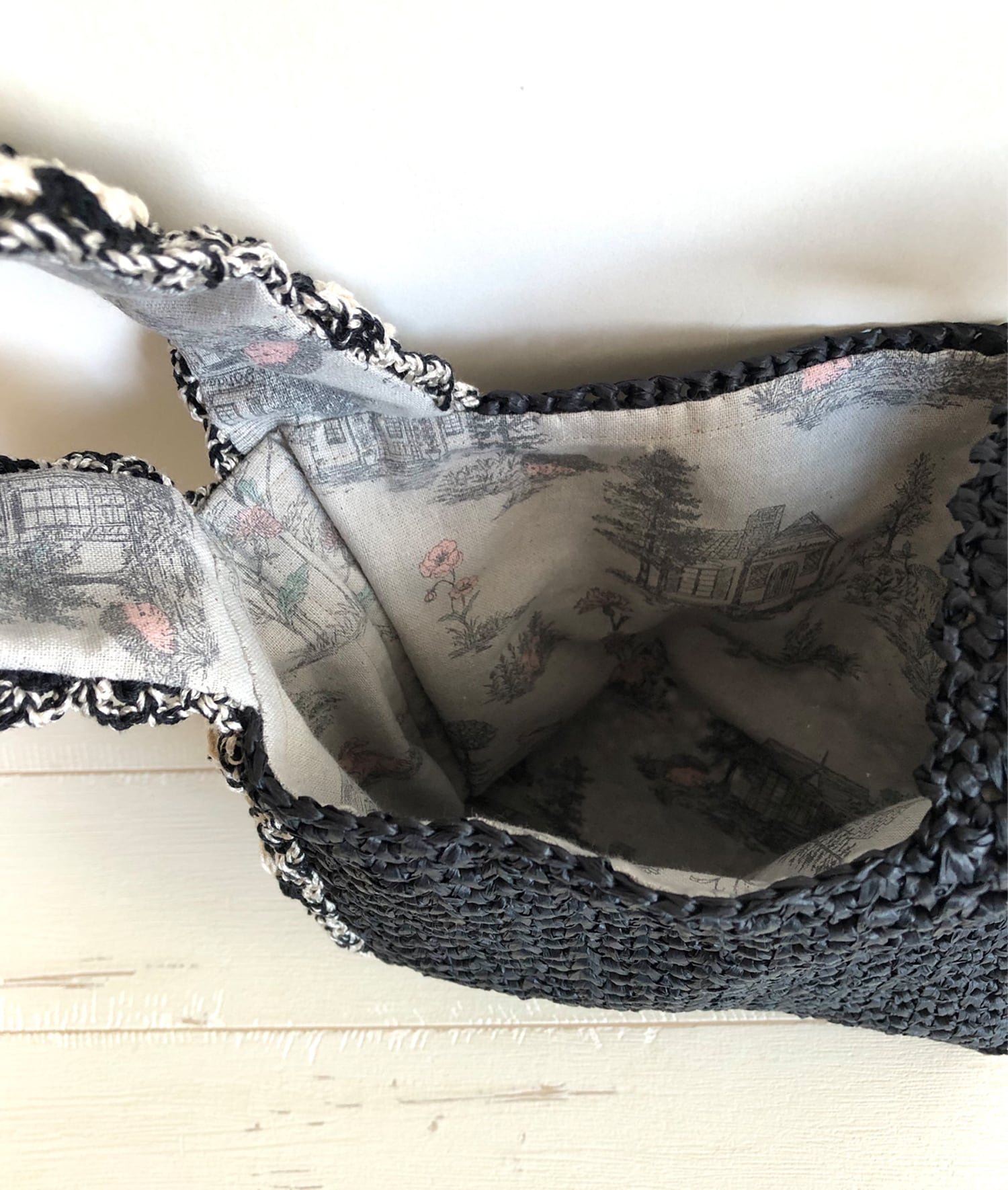 かぎ針モチーフ繋ぎをアクセントに、ヘンプヤーンで編んだカジュアルなワンハンドルバケットバッグ。ハンドメイドらしいオリジナリティーを訴求ポイントにして作りました。本体のヘンプヤーンがとても軽い素材なので重さの負担を感じません。また丈夫な作りにするためにフランス製の可愛い柄の内袋も付けました。何より人目を惹く印象としては、コロンとした三角型の可愛いシルエット、そしてモノトーンカラーの大人っぽいガーリーティストが乙女心をくすぐるデザインバッグです。