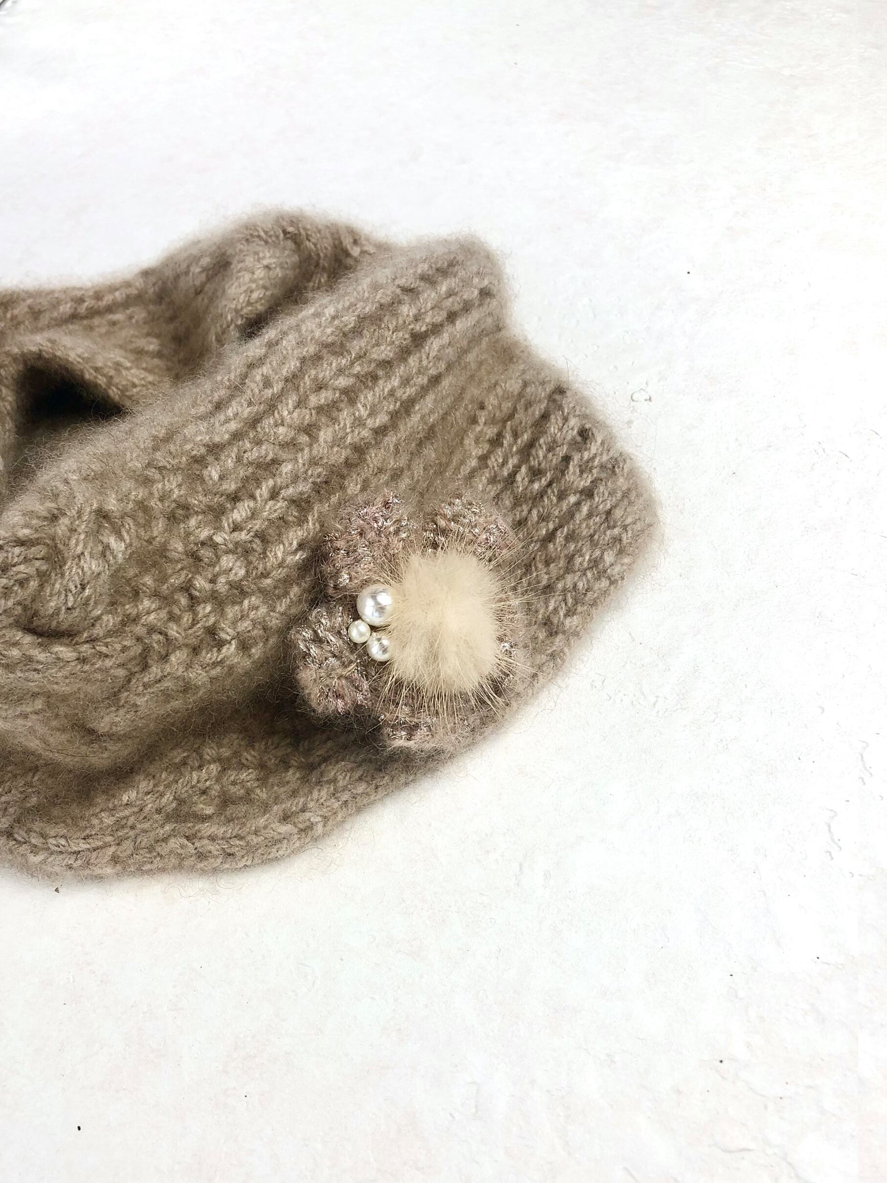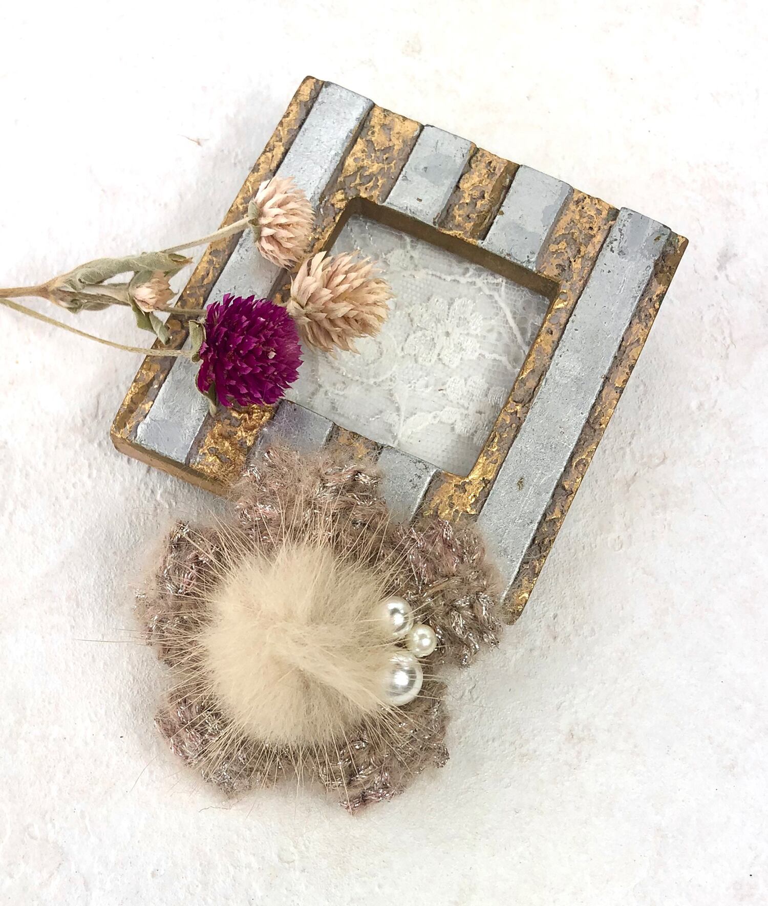 ファーポンポン付きかぎ針編み花ブローチ(ベージュ)